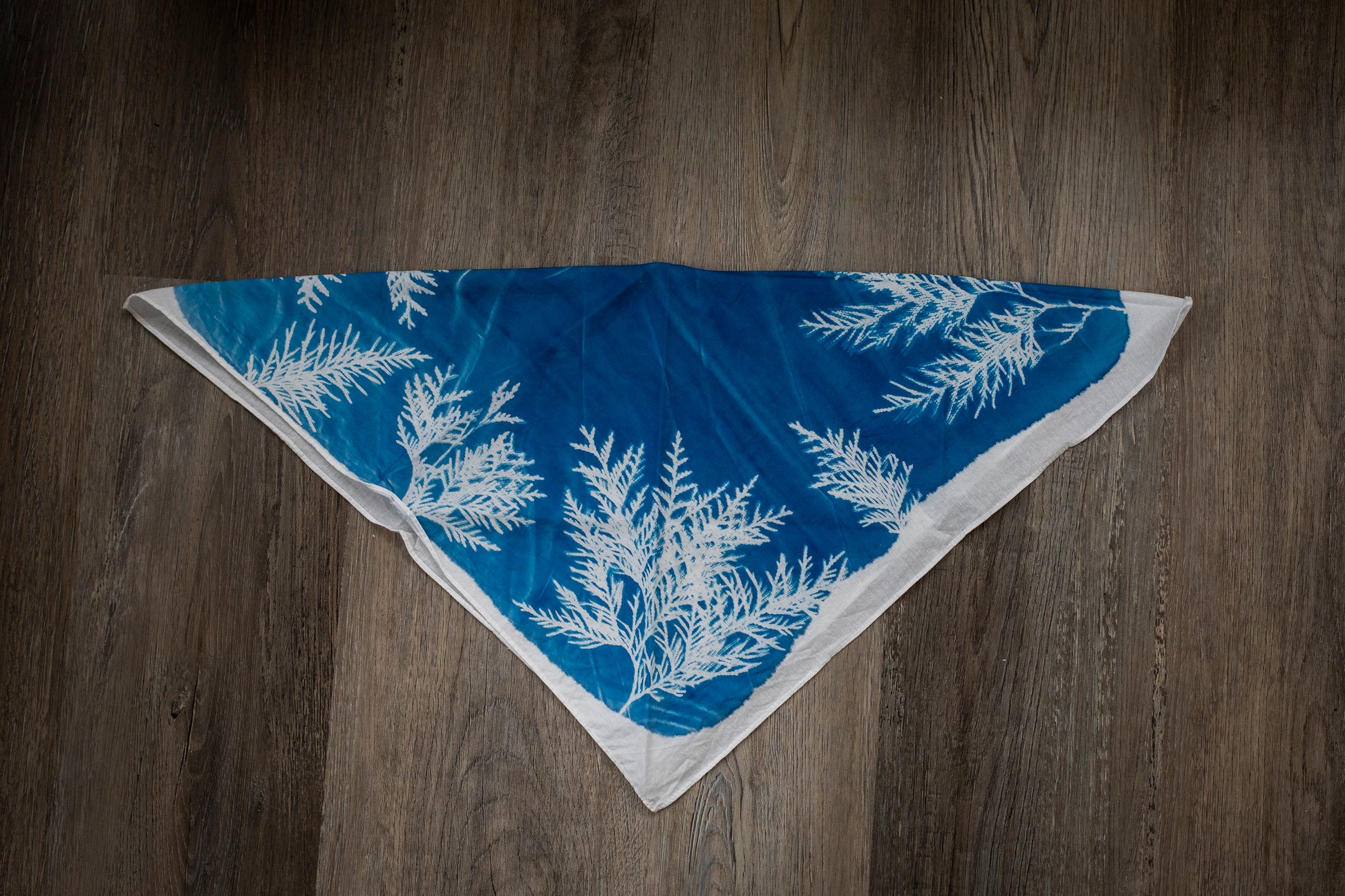 A bandana can be worn, used or displayed in countless different ways. Making this a a truly versatile piece. This bandana is one-of-a kind, hand-printed cyanotype, with ethically collected Eastern White Cedar from Southern Ontario.