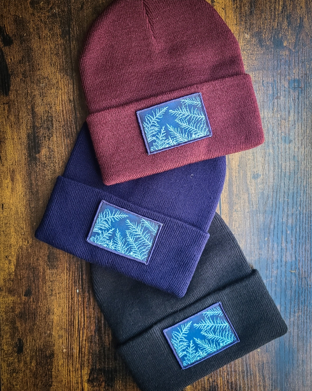 A new addition this year. White Cedar Cyanotype Patch, printed here in Ontario. Available in three cozy colours.
