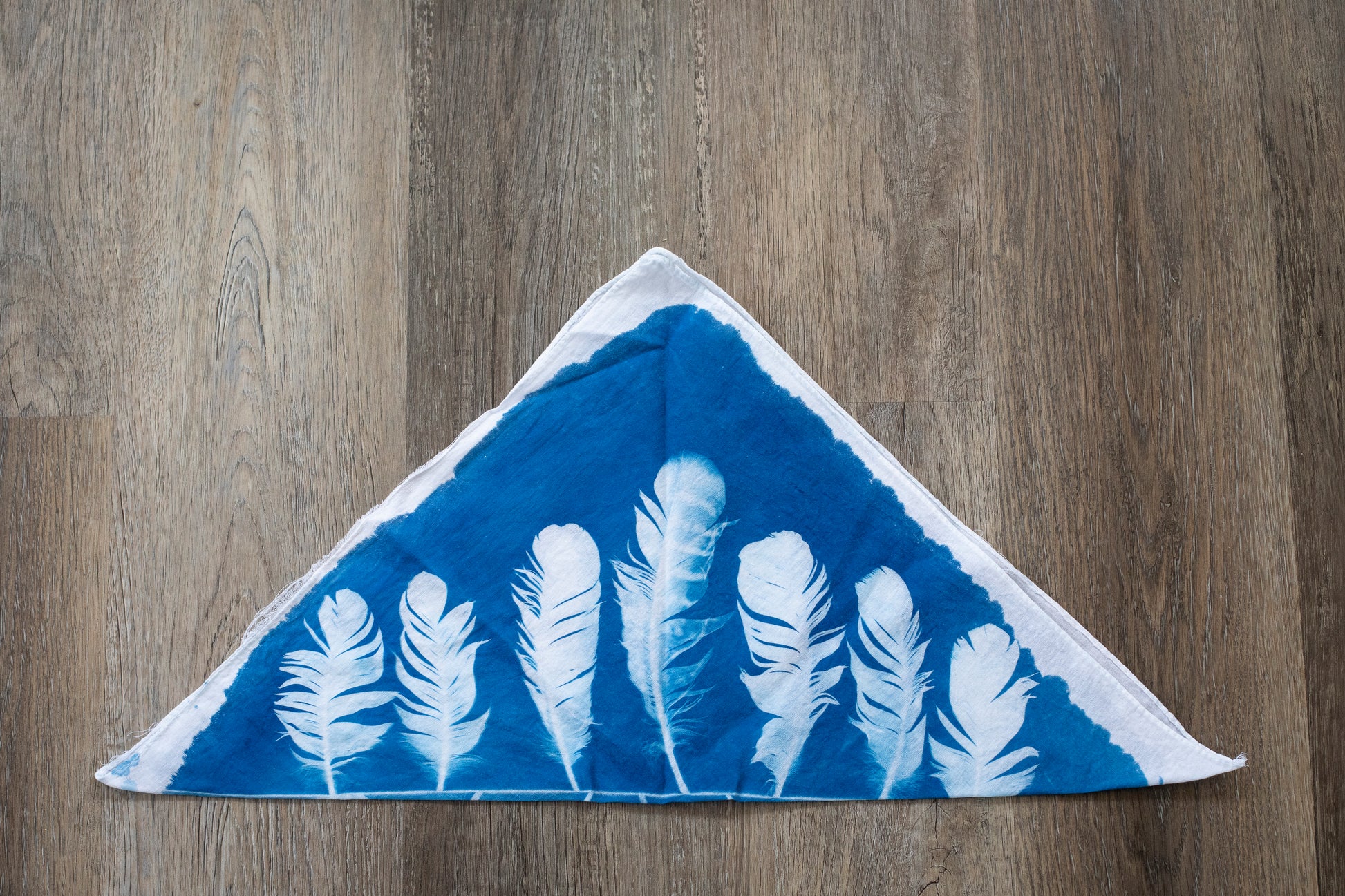 A bandana can be worn, used or displayed in countless different ways. Making this a a truly versatile piece. This bandana is one-of-a kind, hand-printed cyanotype, with ethically collected feathers from Southern Ontario.