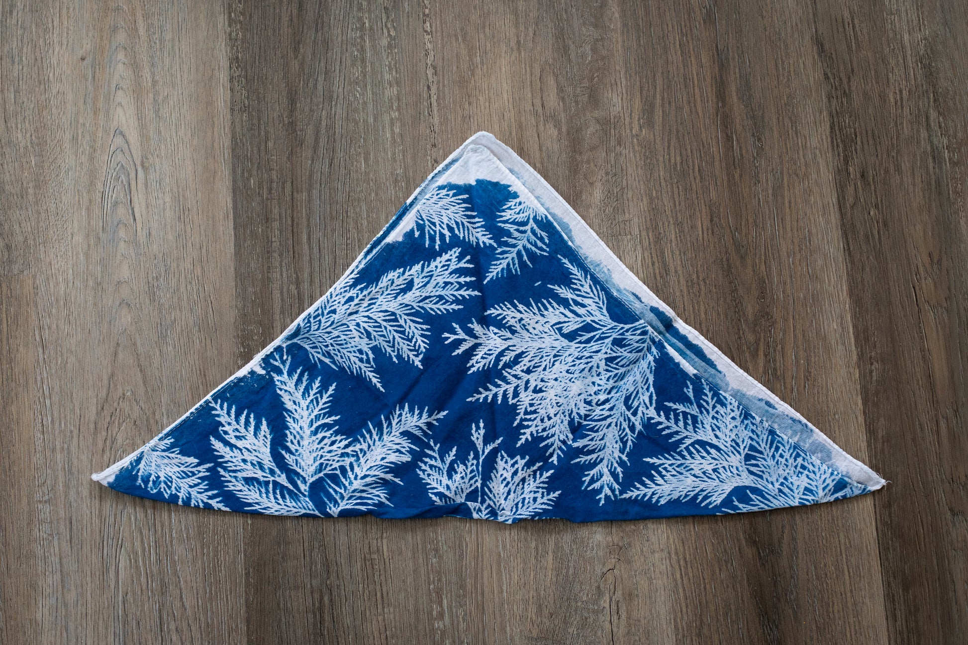 A bandana can be worn, used or displayed in countless different ways. Making this a a truly versatile piece. This bandana is one-of-a kind, hand-printed cyanotype, with ethically collected Eastern White Cedar from Southern Ontario.